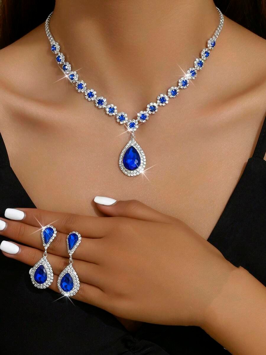 Complementing the necklace are matching earrings, each showcasing an elegant double waterdrop design. With 2 royal blue rhinestones and over 55 shimmering white crystals on each earring, they offer the perfect blend of dainty charm and bold style.
