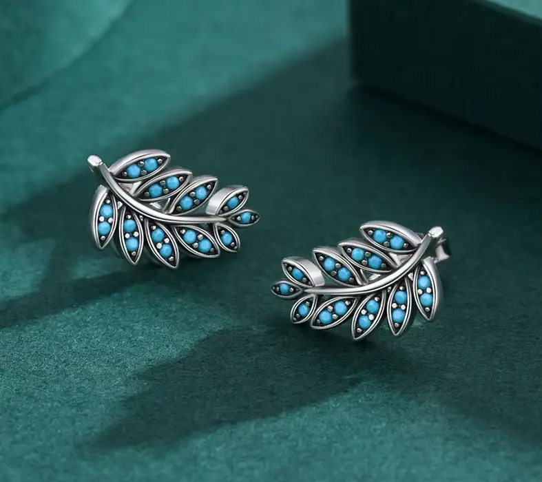 Elegant leaf-shaped earrings with shimmering turquoise crystals for a luxurious touch.