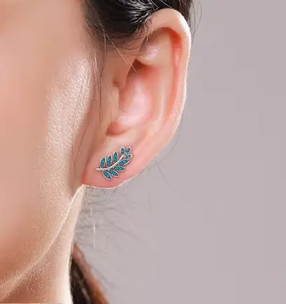 Each leaf is adorned with dazzling light blue turquoise crystals, adding a touch of serene beauty to these charming earrings. Seven larger leaves near the base are set with two sparkling crystals each, while the three smaller leaves towards the periphery hold one crystal each, enhancing the earrings’ intricate detailing. This thoughtfully arranged design mimics the natural beauty of pinnate leaves, giving the earrings an elegant, nature-inspired appeal.