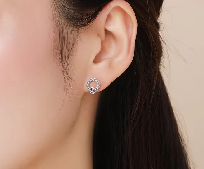 The delicate circular frame, embedded with nine shimmering zirconia stones, gracefully surrounds a larger, dazzling central zirconia, creating a mesmerizing halo effect. The highly polished sterling silver setting enhances the brilliance of the stones, ensuring that these earrings catch the light from every angle, making them ideal for special occasions or everyday elegance.