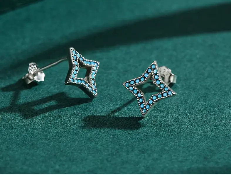 Add a touch of celestial elegance to your jewelry collection with the Starry Luxe Earrings. These exquisite earrings are designed to captivate, featuring a charming star shape crafted in luxurious 925 sterling silver. Adorned with 25 sparkling turquoise crystals, these earrings shine with an ethereal glow, offering a glamorous yet delicate finish. The combination of the light blue turquoise stones and the sterling silver design creates a sophisticated contrast, making them perfect for adding a pop of color and luxury to any outfit.